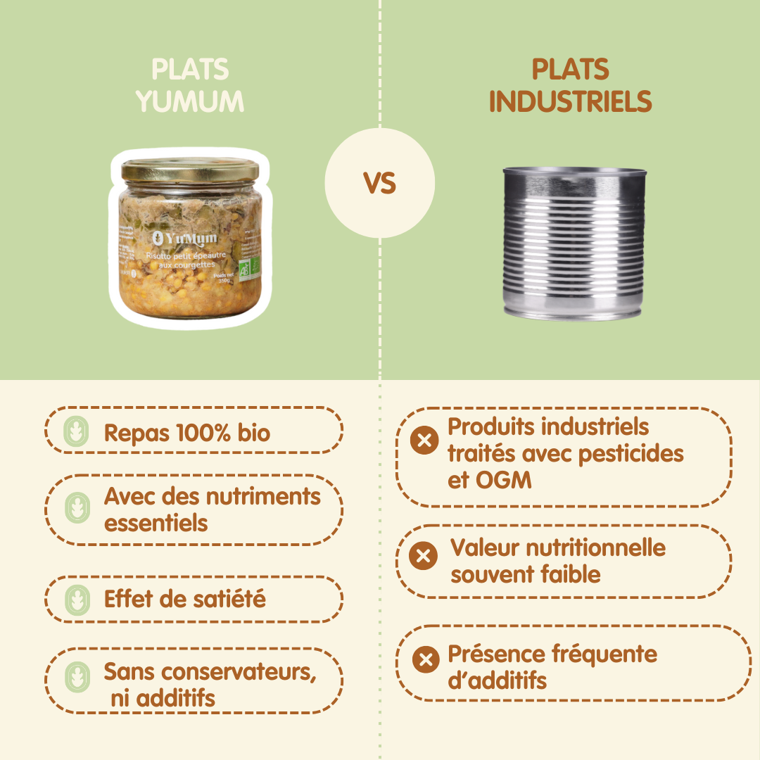 Détails de nos ingrédients : Petit épeautre (28%), eau, courgettes (25%) , crème de riz, huile de tournesol désodorisée, épaississant: farine de graines de caroube, sel de mer), raisins secs, sel, berbére mix