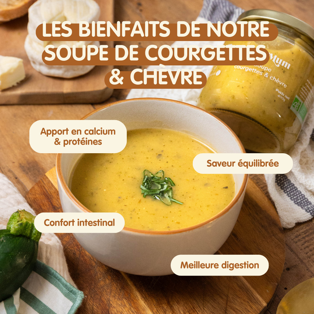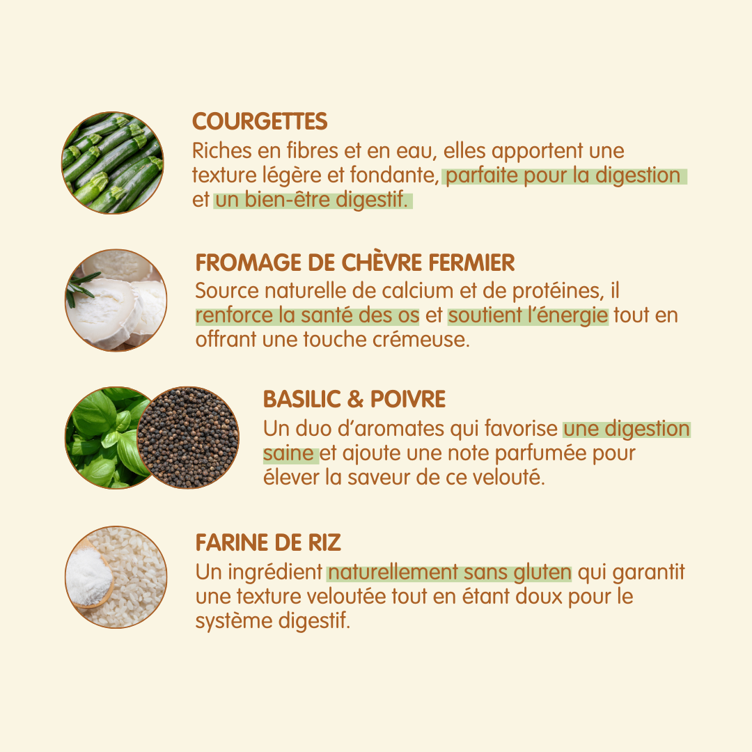Une soupe onctueuse et réconfortante où la douceur des courgettes se marie à l’intensité du fromage de chèvre affiné. Sublimée par une touche de basilic et une pointe de poivre, elle offre un équilibre parfait entre gourmandise et légèreté.