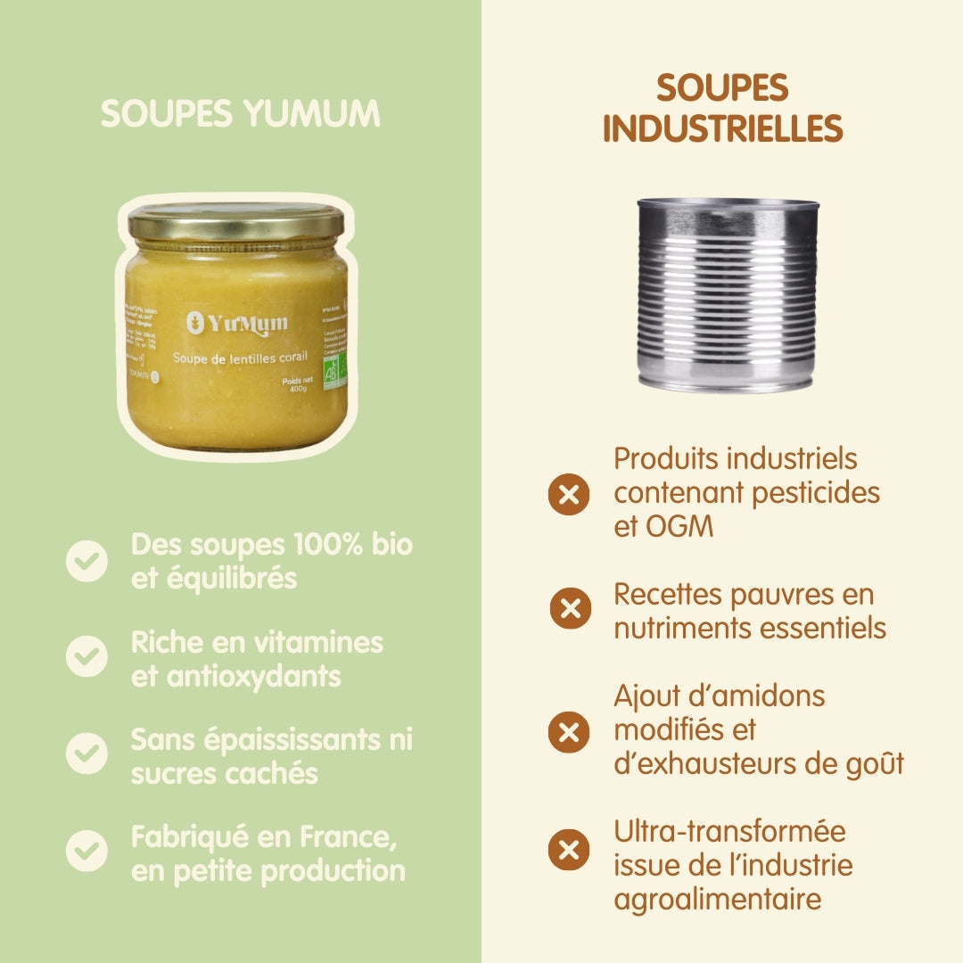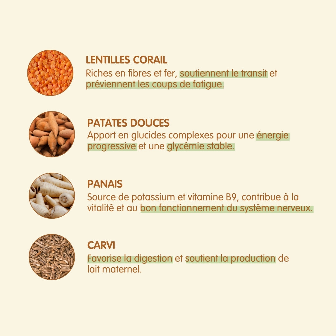 Détails de nos ingrédients : Lentilles corail, patates douces, panais, oignon, huile de tournesol, sel, carvi